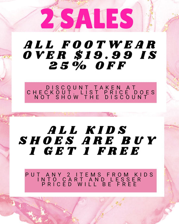 SALE: 25% OFF EVERYTHING over $19.99 All kids shoes are BOGO FREE. DISCOUNT TAKEN AT CHECKOUT. Prices listed do NOT reflect the discount.