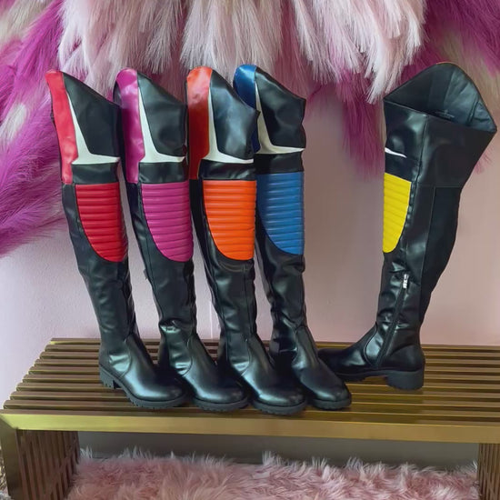 NORRIS-1 Yellow/Black Faux Leather Over Knee Moto Boot - Motorcycle Styling Detail