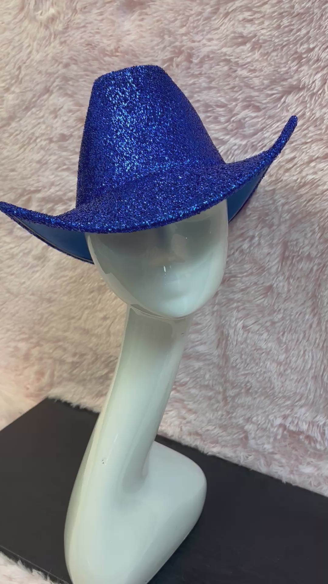 This Glittery blue cowboy hat features a shimmering glitter finish with a classic cowboy shape. Inside, an adjustable ribbon allows for a personalized fit, while its firm, durable structure ensures lasting shape and comfort.