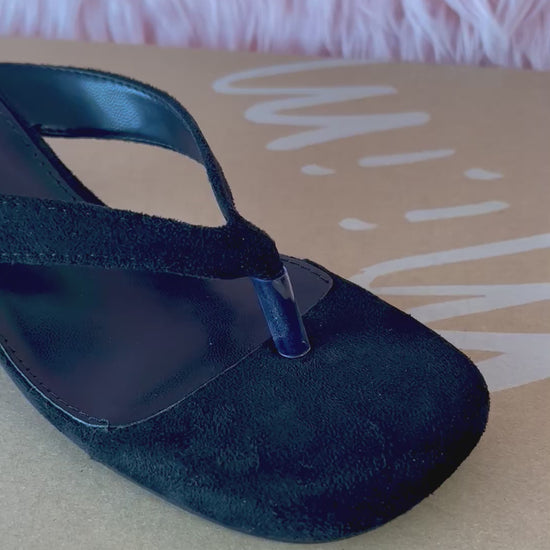 Meet the SELL OUT Thong Kitty Heel, where playful meets polished. Featuring a rounded square toe and soft suede finish, these black mules add a chic twist to your wardrobe. The thong-style strap and comfy kitten heel make them perfect for dancing through your day with a flirty, fun vibe.